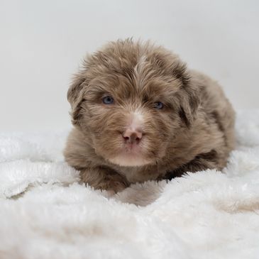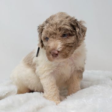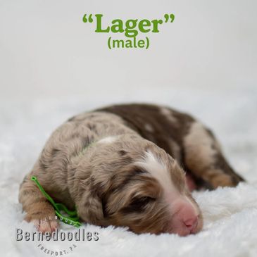 Born 9/30/2025 Lager is a male multi-gen Bernedoodle. He is about 44% Bernese Mountain Dog and is a stunning brown merle with ample white accents. He will be very low to no shed and ready for his new home the end of November. Lager is offered at $3500