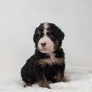 Nitro is a male phantom colored medium size Bernedoodle pup. Mila's pups are smaller and have a curly vs wavy coat. Nitro was born 10/6/2025 and has a go home date the week of December 1st.