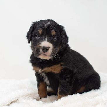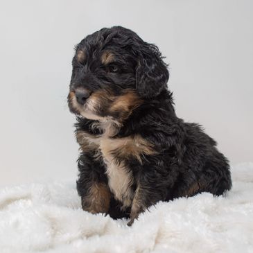 Born 9/30/2025 Growler is a male multi-gen Bernedoodle. He is about 44% Bernese Mountain Dog and is a stunning traditional tri color with a white tipped tail. He will be very low to no shed and ready for his new home the end of November. Growler is offered at $3500