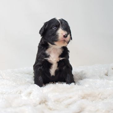Born 10/3/2025 Rolo is a male multi-gen Bernedoodle. He is about 44% Bernese Mountain Dog and is a lovely black and white bi colored pup. He will be very low to no shed and ready for his new home the beginning of December. Rolo is offered at $3500